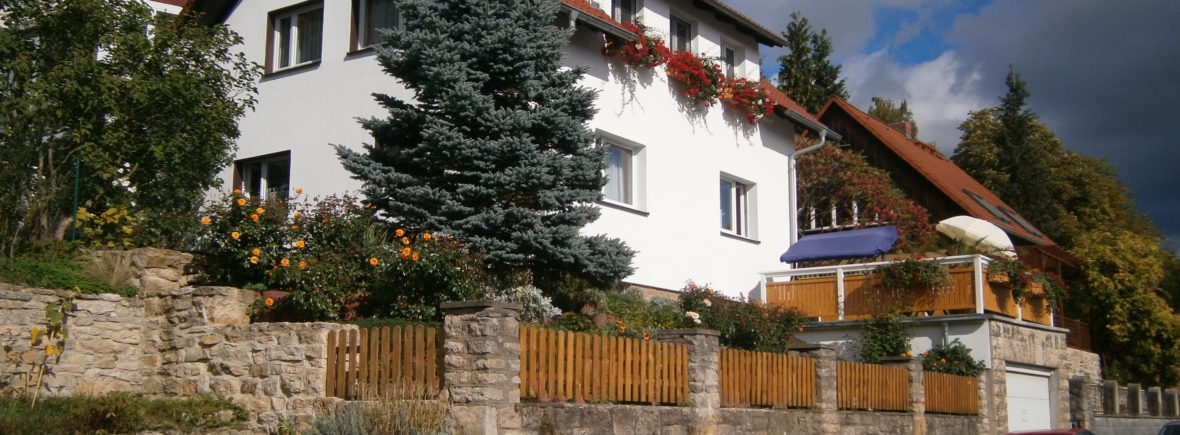 Wir bieten Ihnen eine komplett renovierte und neu ausgestattete Nichtraucher-Ferienwohnung (60 m² mit WoZi, SchlaZi, Küche, Bad) im Zweifamilienhaus in ruhiger Hanglage im Grünen mit herrlichem Panoramablick über das Saaletal bis hin zum Stadtzentrum Jenas.